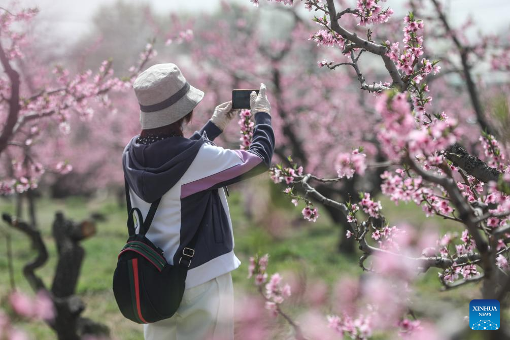 A tourist takes photos of peach blossoms in Lanzhou, northwest China's Gansu Province, April 19, 2025. (Xinhua/Lang Bingbing)