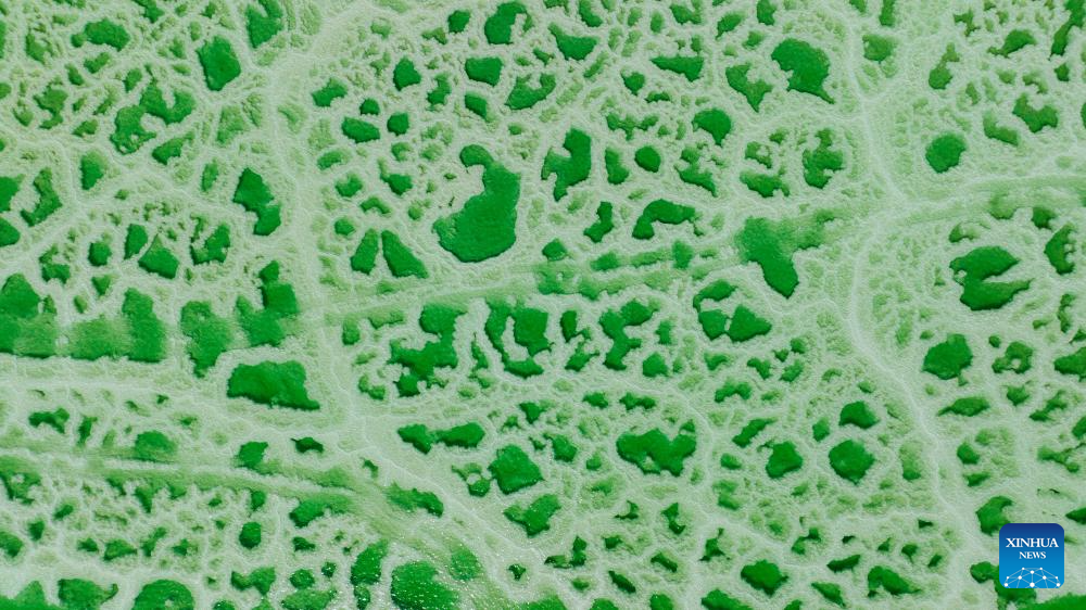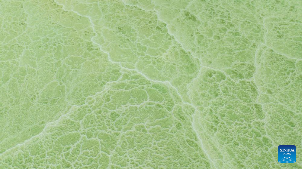 An aerial drone photo taken on April 19, 2025 shows the Jade Lake in Mangya, Haixi Mongolian and Tibetan Autonomous Prefecture of northwest China's Qinghai Province. Because of the difference in its depth and the concentration of minerals in the water, the Jade Lake takes on a number of hues, making it a popular scenic spot. (Xinhua/Du Xiaowei)