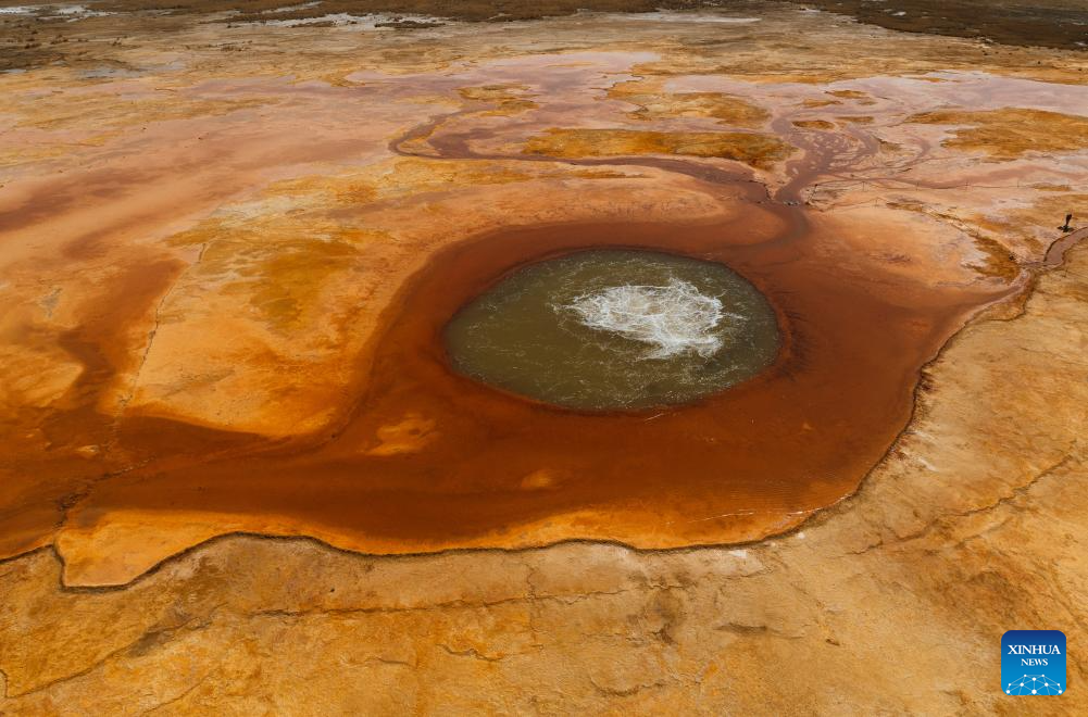 An aerial drone photo taken on April 19, 2025 shows the Aiken Spring in Mangya, Haixi Mongolian and Tibetan Autonomous Prefecture of northwest China's Qinghai Province. Located in northwest China's Qinghai Province, Aiken Spring is dubbed the "Eye of the Earth." This rare geological wonder forms a unique pupil shape from above, with spring water and surrounding deep red sediments resembling an eye embedded in the land. (Xinhua/Du Xiaowei)