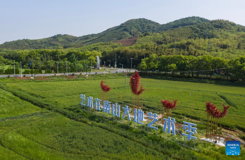 Taking the vast land as canvas and natural elements as medium, the artists skillfully integrated various art forms such as art installation and landscape art into the fields and villages, allowing tourists and local people to enjoy the art works in the countryside. (Xinhua/Xu Yu)