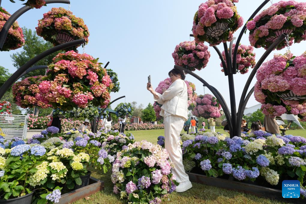 A visitor takes photos of flowers during the 2025 World Garden Show in Haining City, east China's Zhejiang Province, April 28, 2025. The event kicked off here on Monday with a total exhibition area of 500,000 square meters. (Xinhua/Weng Xinyang)
