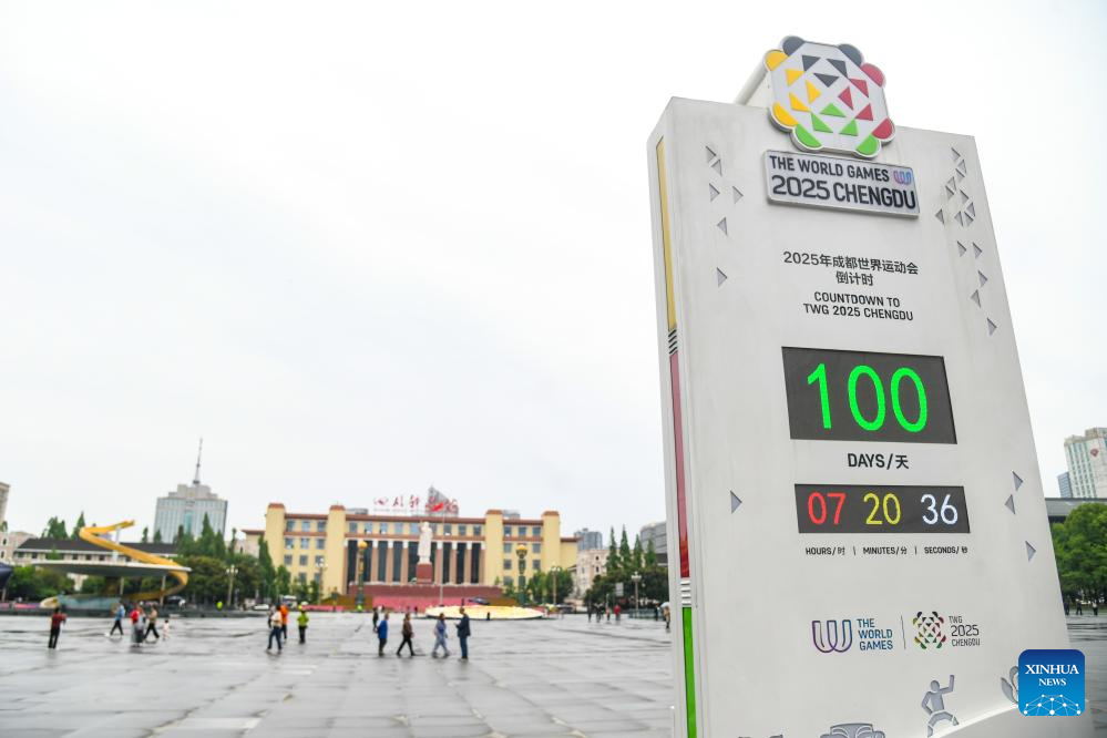 This photo taken on April 29, 2025 shows a countdown clock marking 100 days to go for the World Games 2025 in Chengdu, southwest China's Sichuan Province. The Games will be held in Chengdu from Aug. 7 to 17. (Xinhua/Wang Xi)
