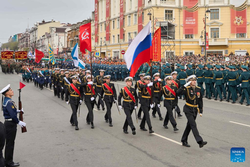 Servicemen marching in formation are pictured during a military parade to commemorate the 80th anniversary of the Victory in the Great Patriotic War in Vladivostok, Russia, May 9, 2025. (Photo by Guo Feizhou/Xinhua)
