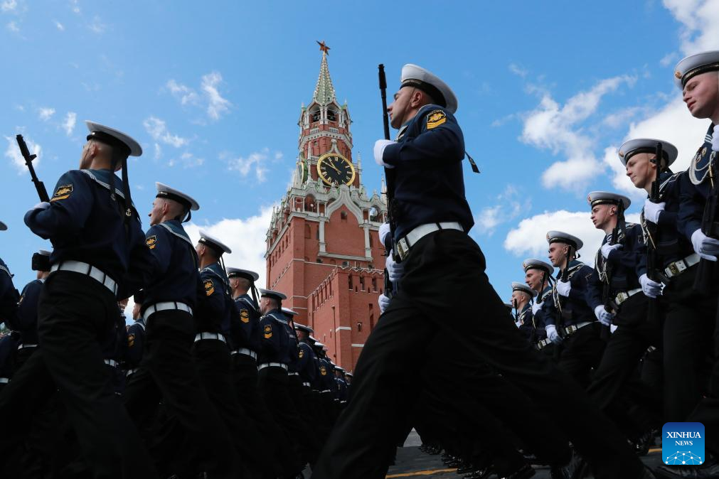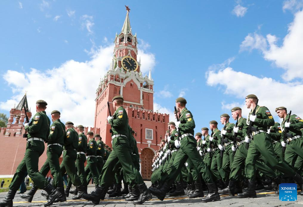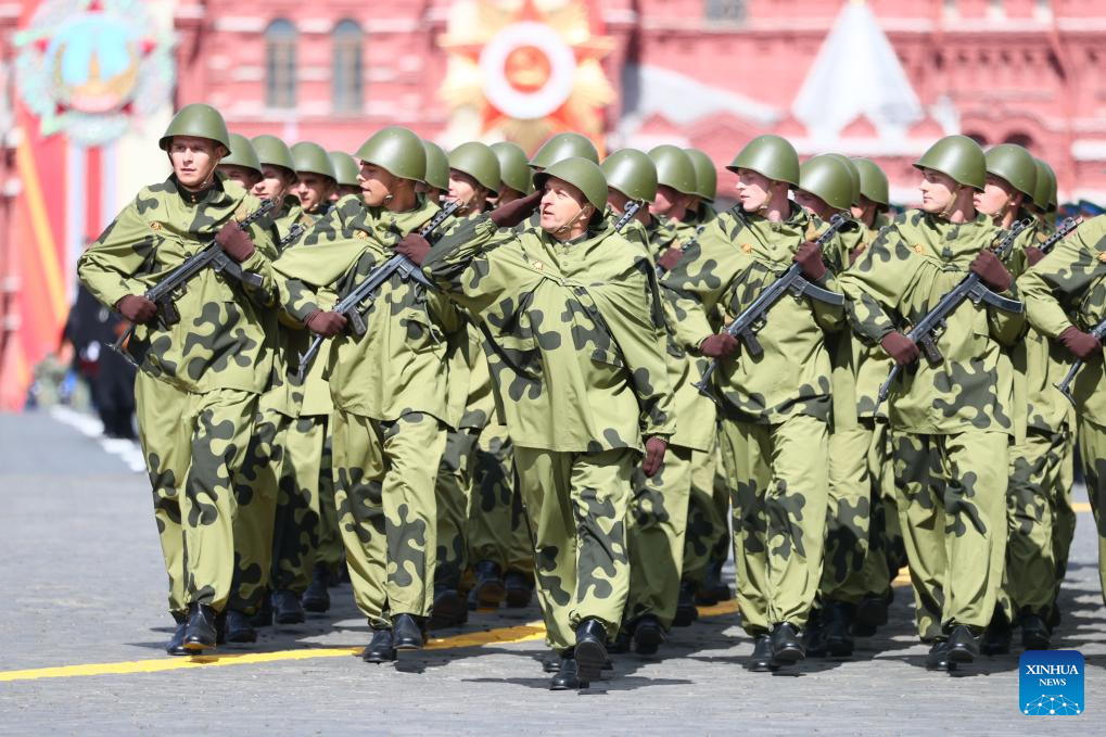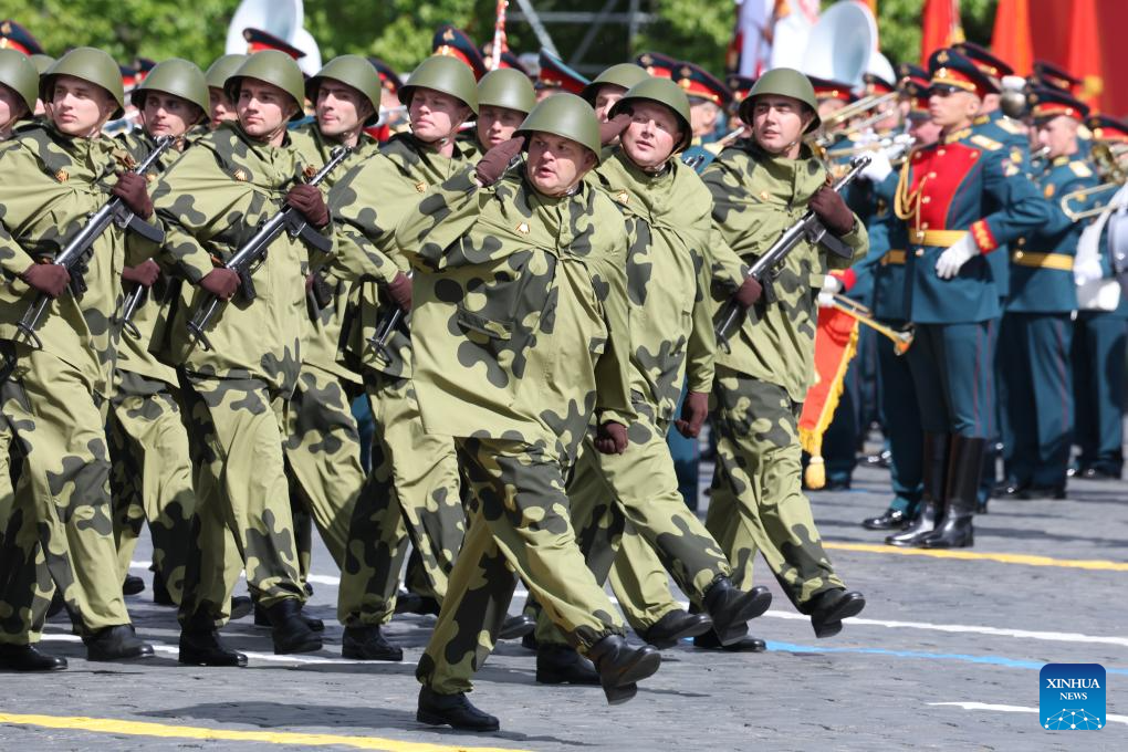 Soldiers march during a grand parade marking the 80th anniversary of the victory in the Soviet Union's Great Patriotic War in Moscow, Russia, May 9, 2025. (Xinhua/Lai Xiangdong)