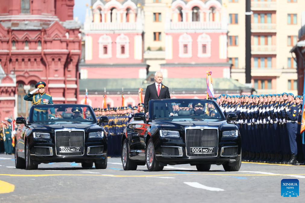 Russian Defense Minister Andrei Belousov prepares to review the troops during a grand parade marking the 80th anniversary of the victory in the Soviet Union's Great Patriotic War in Moscow, Russia, May 9, 2025. (Xinhua/Lai Xiangdong)