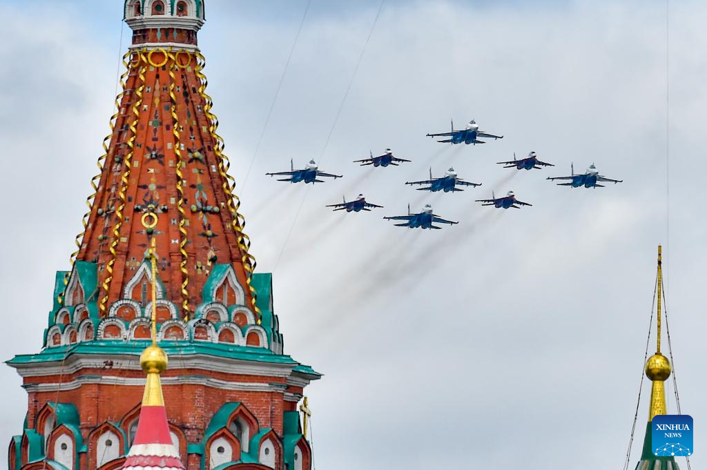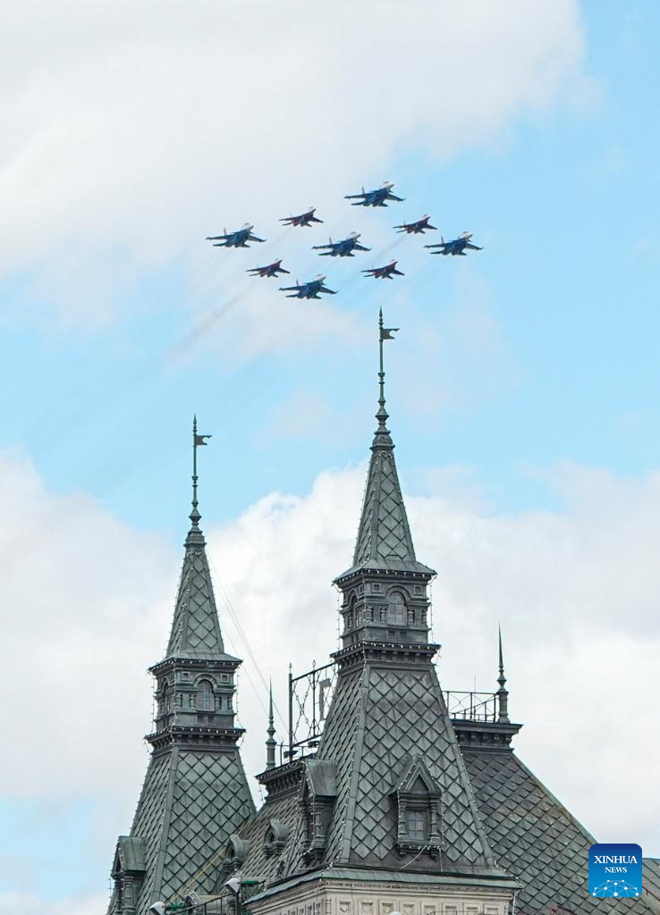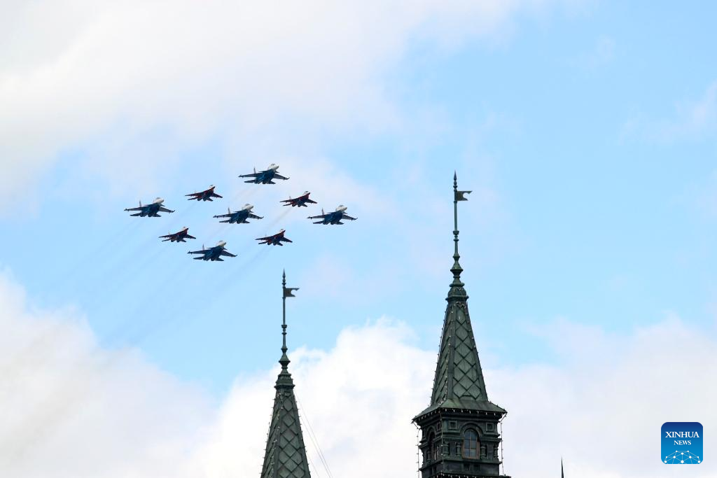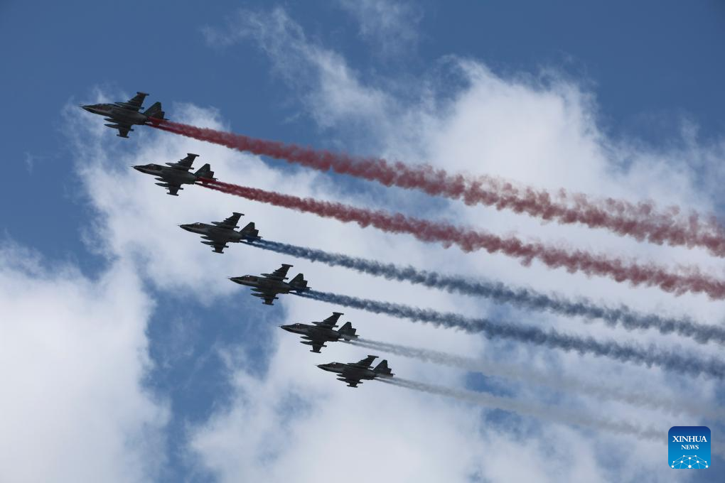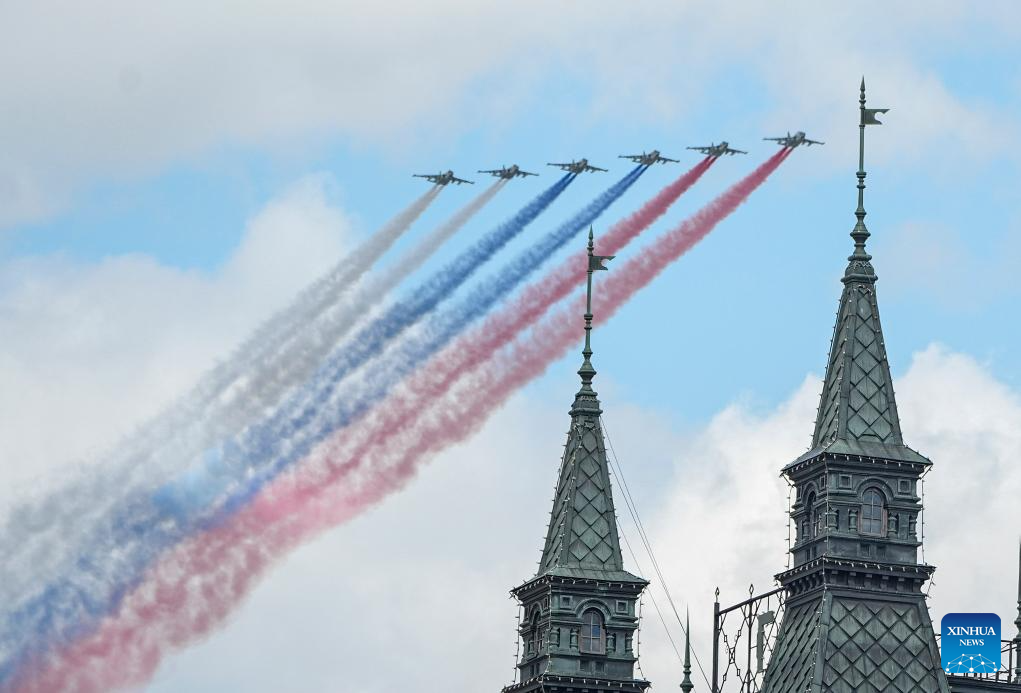 Aircraft fly in formation during a grand parade marking the 80th anniversary of the victory in the Soviet Union's Great Patriotic War in Moscow, Russia, May 9, 2025. (Xinhua/Lai Xiangdong)