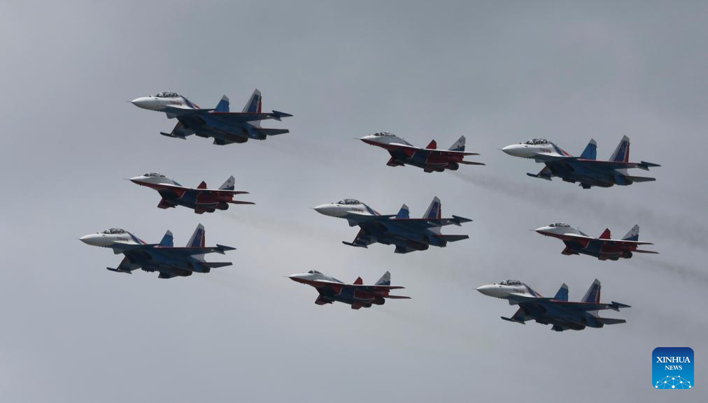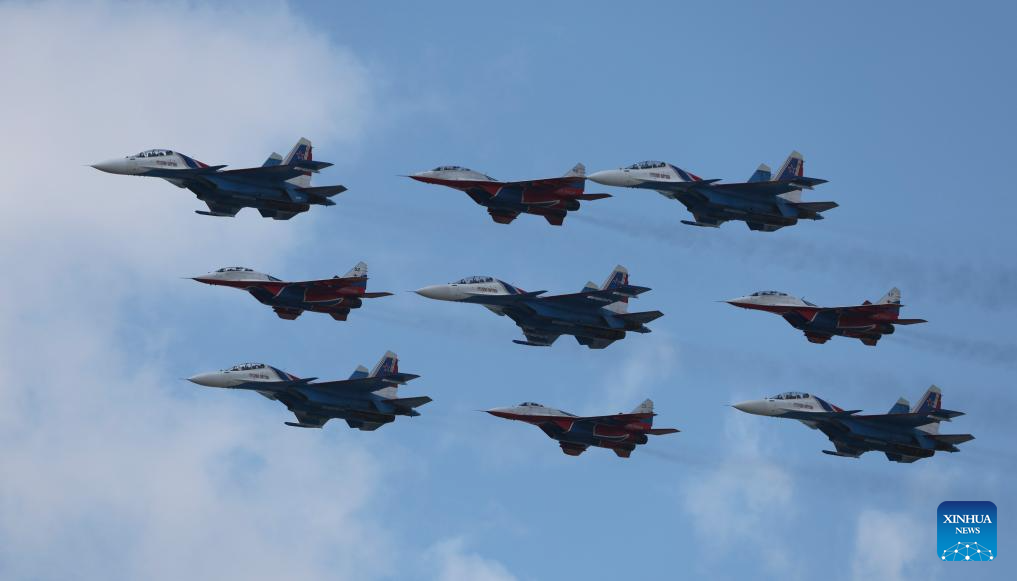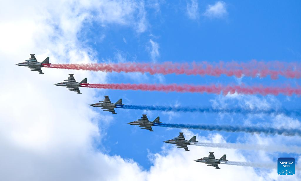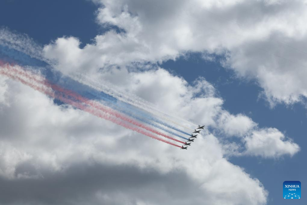 Aircraft fly in formation during a grand parade marking the 80th anniversary of the victory in the Soviet Union's Great Patriotic War in Moscow, Russia, May 9, 2025. (Xinhua/Zhang Ling)