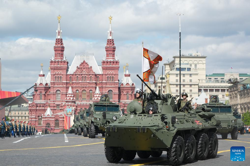 Armored vehicles march during a grand parade marking the 80th anniversary of the victory in the Soviet Union's Great Patriotic War in Moscow, Russia, May 9, 2025. (Xinhua/Bai Xueqi)