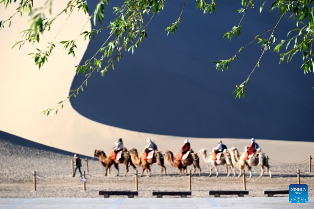 Tourists enjoy camel rides at the Mingsha Mountain and Crescent Spring scenic spot in Dunhuang, northwest China's Gansu Province, May 10, 2025. (Photo by Zhang Xiaoliang/Xinhua)