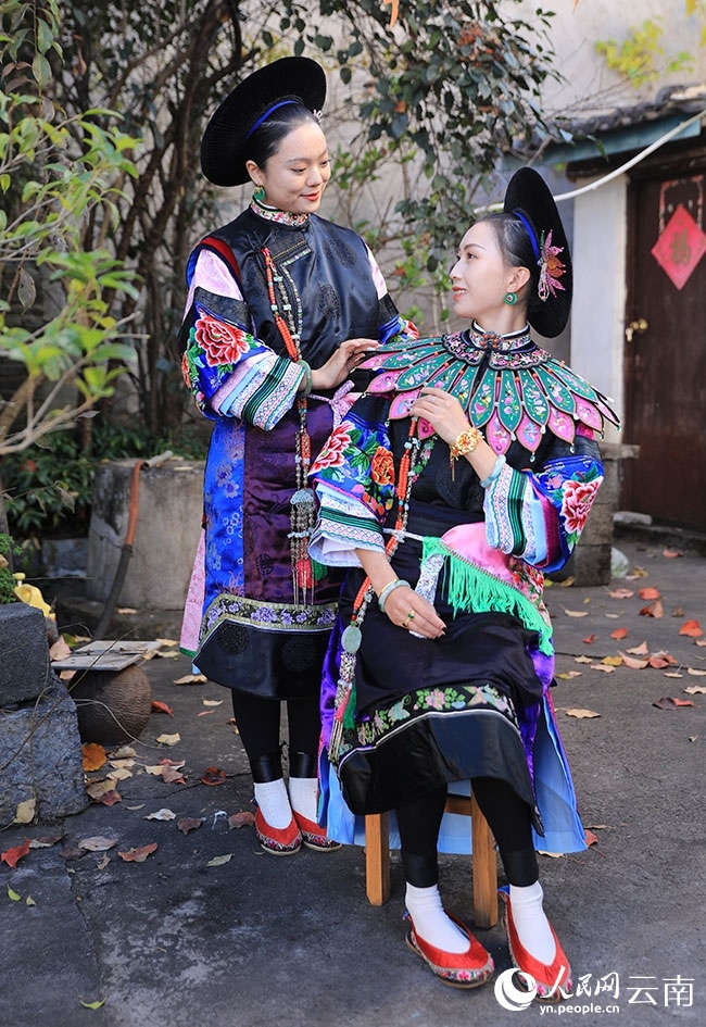 A Bai ethnic woman adjusts an embroidered accessory on another woman in Diannan town, Heqing county, southwest China's Yunnan Province. (Photo/Jiang Ze)