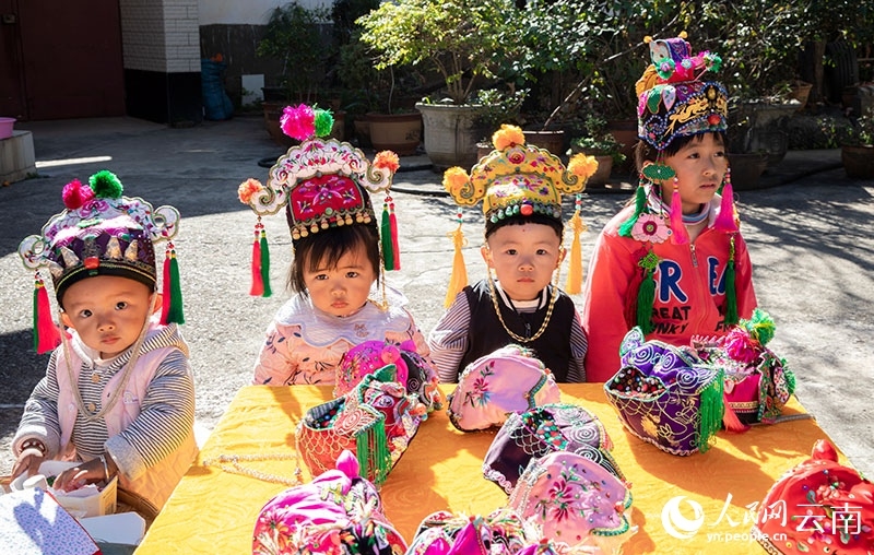 Children wear traditional hats with tiger head patterns in Diannan town, Heqing county, southwest China's Yunnan Province. (Photo/Jiang Ze)