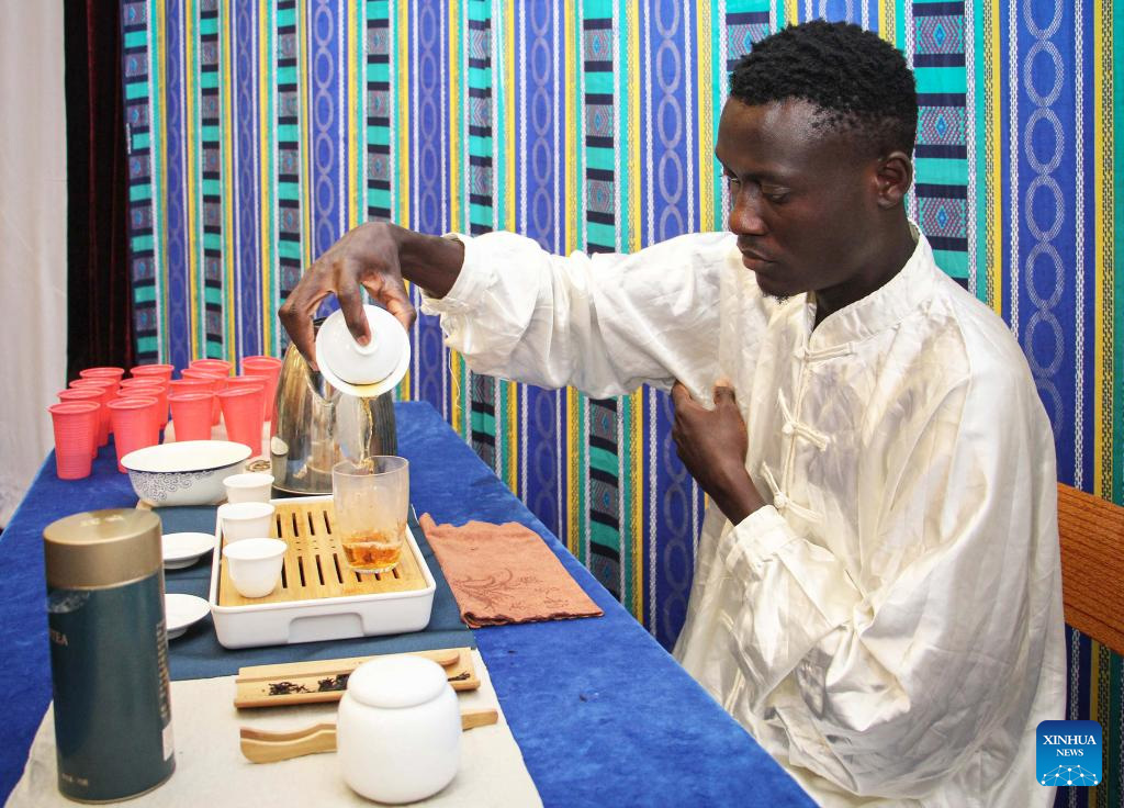 A student from the Confucius Institute demonstrates Chinese tea art at the Chinese Cultural Center in Cotonou, Benin, May 15, 2025.(Photo by Seraphin Zounyekpe/Xinhua)