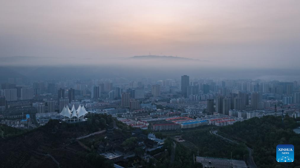 An aerial drone photo taken on May 22, 2025 shows the sunrise scenery in Xining, northwest China's Qinghai Province. (Xinhua/Qi Zhiyue)
