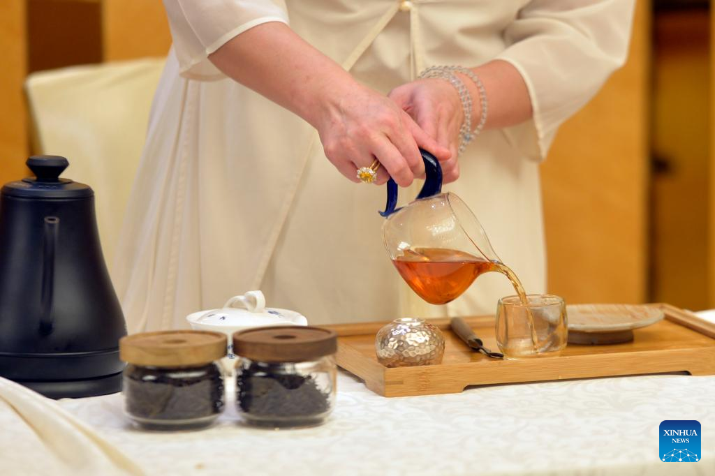 A tea artist demonstrates tea brewing at "Tea for Harmony: YAJI 2025 China-Sri Lanka Cultural Gala" held in Colombo, Sri Lanka, on May 21, 2025. (Photo by Gayan Sameera/Xinhua)