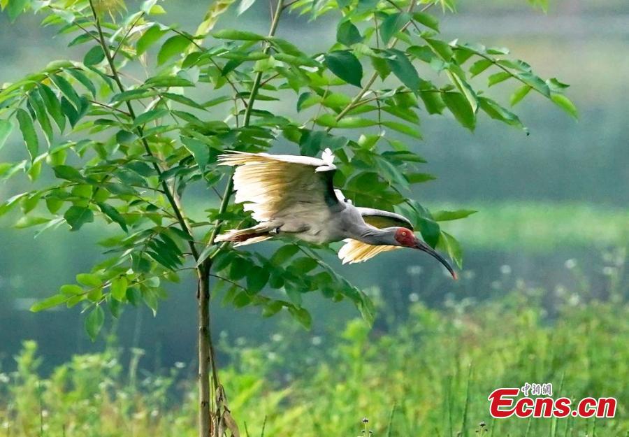 A crested ibis, an endangered bird species once believed to be extinct in China, is released into the wild at Muchuan County, southwest China's Sichuan Province, May 22, 2025. (China News Service/An Yuan)