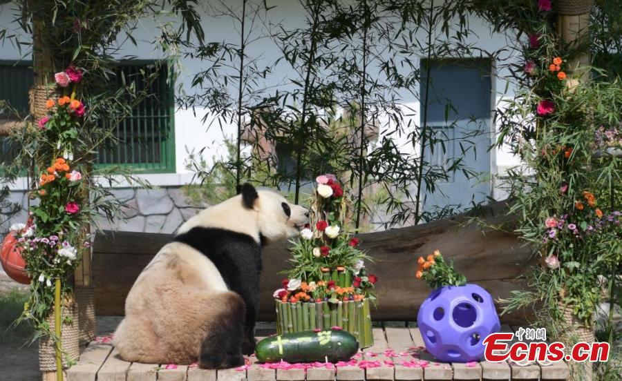 Giant panda Ya Ji enjoys a special cake to celebrate its 11th birthday at Jinan zoo in east China's Shandong Province, May 25, 2025. (China News Service/Zhang Yong)