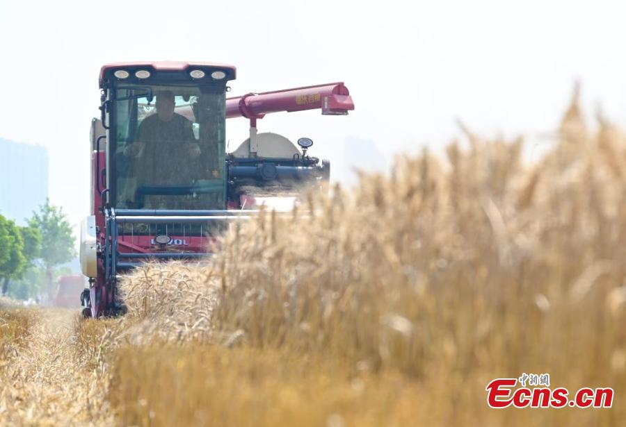 Harvesters work in a wheat field near Hangzhou's CBD, east China's Zhejiang Province, May 26, 2025. (China News Service/Wang Gang)