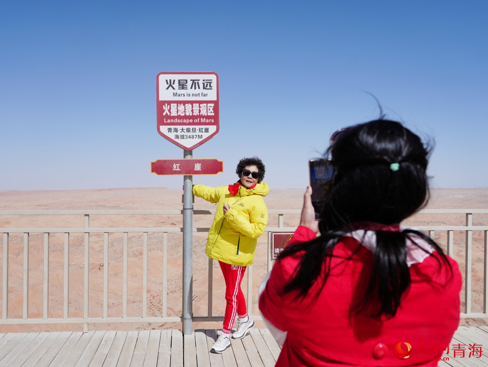 A tourist poses for photos at the Mars-like red cliff region in Da Qaidam, also known as Dachaidan district, in the Haixi Mongolian and Tibetan Autonomous Prefecture, northwest China's Qinghai Province. (People's Daily Online/Kuang Yu)