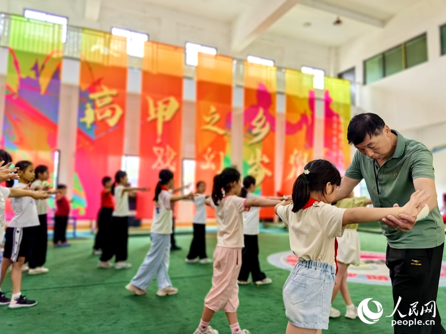 Lin Guochun teaches children the basic movements of Gaojia Opera at an inheritance center in Cendou village, Shijing town, Nan'an, a county-level city in Quanzhou, southeast China's Fujian Province. (People's Daily Online/Su Haisen)