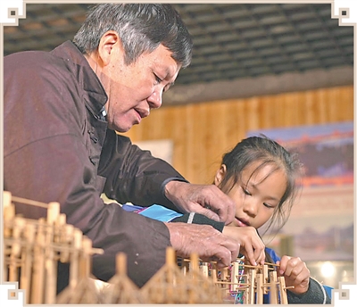 Yang Siyu instructs his granddaughter to build a wooden-structure building model. (Photo/Yang Xiaolei)