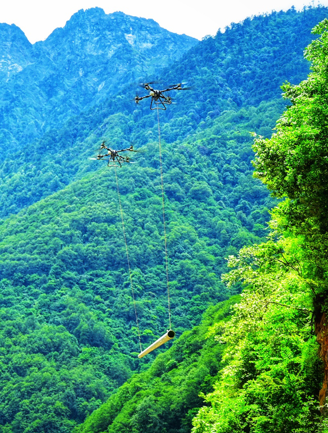 A 160-kilogram power pole was steadily hoisted across the Dulong River through the coordinated efforts of two drones working in tandem.