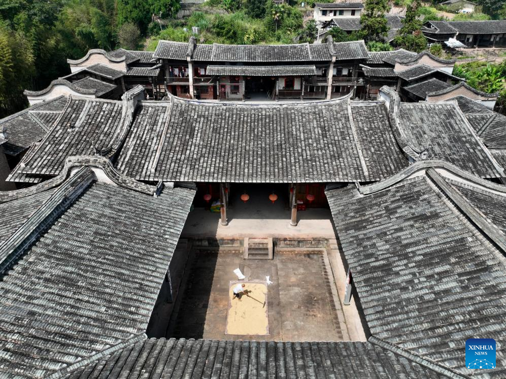 A resident spreads out unhusked rice to dry in Zhutou Manor in Yongtai County, southeast China's Fujian Province, on Oct. 2, 2023. Nestled in the Daiyun Mountain like scattered pearls, over 2,000 fortified manors in Yongtai County trace their origins to the Tang Dynasty (618-907 AD), flourishing later during the Ming (1368-1644) and Qing (1644-1911) eras.