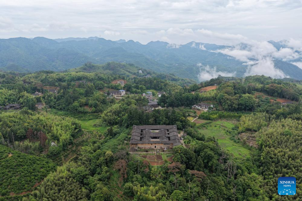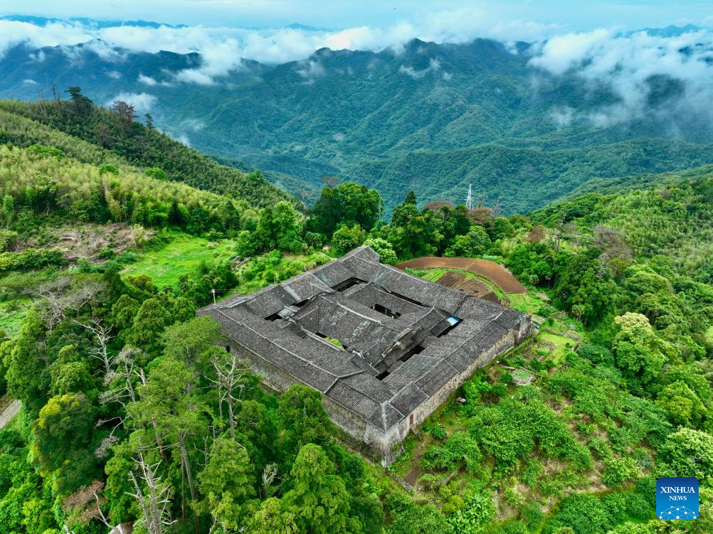 An aerial drone photo taken on May 20, 2025 shows Hecheng Manor in Yongtai County, southeast China's Fujian Province. Nestled in the Daiyun Mountain like scattered pearls, over 2,000 fortified manors in Yongtai County trace their origins to the Tang Dynasty (618-907 AD), flourishing later during the Ming (1368-1644) and Qing (1644-1911) eras.