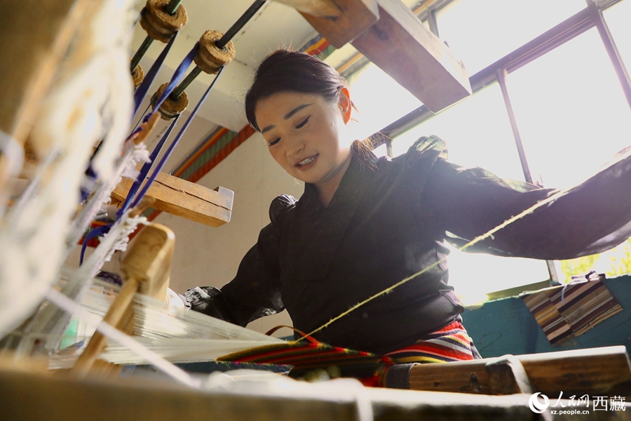 National role model worker Tenzin Drolkar weaves traditional aprons at her loom at an apron cooperative in Jedeshol town, Gonggar county, Shannan city, southwest China's Xizang Autonomous Region. As colorful threads fly, a Tibetan apron known as "Bangdian" takes shape beneath her skilled hands.