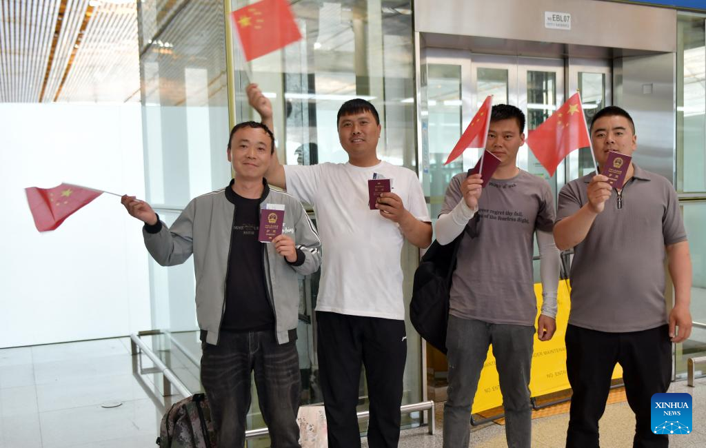 Passengers evacuated from Iran pose for photos at Beijing Capital International Airport, in Beijing, capital of China, June 22, 2025. The second charter flight carrying 119 Chinese nationals evacuated from Iran arrived at Beijing Capital International Airport from Turkmenistan on Sunday. (Photo by Zu Guobao/Xinhua)