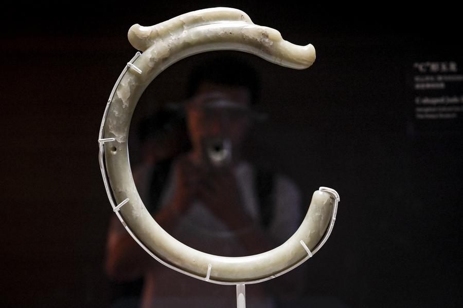 Visitors appreciate an exhibit during a media preview of the exhibition titled "Legends of Dragon: The Ancient Civilization of Hongshan Culture" at the Shanghai Museum East in east China's Shanghai, June 25, 2025. (Photo by Chen Haoming/Xinhua)