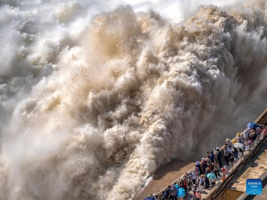 People watch the water and sediment regulating operation at Sanmenxia Reservoir in central China's Henan Province, July 4, 2025. The reservoir on Friday increased water discharge at a volume of 2,800 cubic meters per second to clear up the sediment in the Yellow River. (Photo by Du Jie/Xinhua)