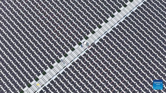 An aerial drone photo taken on July 4, 2025 shows workers inspecting at the site of an floating offshore photovoltaic (PV) project of Sinopec Qingdao Refining &Chemical Co., Ltd. in Qingdao, east China's Shandong Province. The project was connected to the grid for electricity generation recently. Located in the Xihai'an (West Coast) New Area of the east China's coastal city, the project innovatively adopts a floating structure, with the photovoltaic panels rising and falling close to the water surface with the tide, and uses seawater to efficiently dissipate heat to improve power generation efficiency. With an installed capacity of 7.5 megawatts, it is expected to generate nearly 10 million kilowatt-hours of green electricity annually and reduce carbon dioxide emissions by 8,300 tons. Since it was put into use on July 1, the project has generated a total of 123,100 kilowatt-hours of electricity. (Photo by Zhang Jingang/Xinhua)