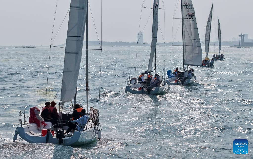 An aerial drone photo taken on July 10, 2025 shows yachts and sailboats participating in a sea cruising event in Laolong Bay area in Qingdao, east China's Shandong Province. A sea cruising event was held in the coastal city of Qingdao on Thursday to celebrate the 20th anniversary of the establishment of the Maritime Day of China and the 620th anniversary of Chinese explorer Zheng He's maritime voyages. (Xinhua/Li Ziheng)
