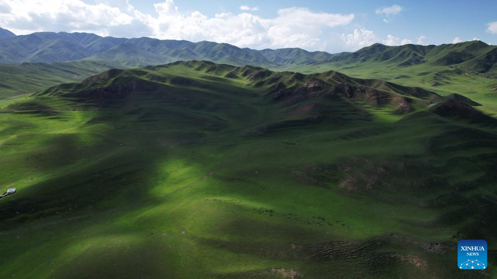 An aerial drone photo taken on July 10, 2025 shows the scenery of the Sangke Grassland in Xiahe County, Gannan Tibetan Autonomous Prefecture, northwest China's Gansu Province. (Xinhua/Ma Ning)