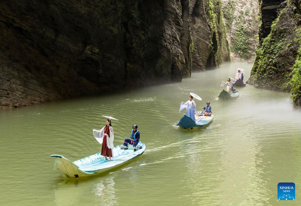 Tourists take boats enjoying the view of Pingshan canyon in Hefeng County, Enshi Tujia and Miao Autonomous Prefecture, central China's Hubei Province, July 9, 2025. Relying on ethnic culture, landscape resources and ecological culture heritage, the tourism market in Enshi continues drawing visitors since the beginning of this summer. (Photo by Zheng Jiayu/Xinhua)
