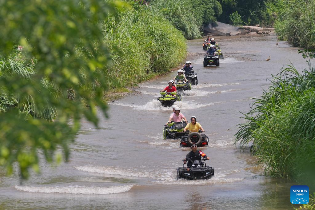 People ride quad bikes at a scenic spot in Beibei District, southwest China's Chongqing Municipality, July 12, 2025. With heatwaves hitting some Chinese provinces and regions in recent days, the scorching temperature has fueled a cooling economy boom. (Photo by Qin Tingfu/Xinhua)