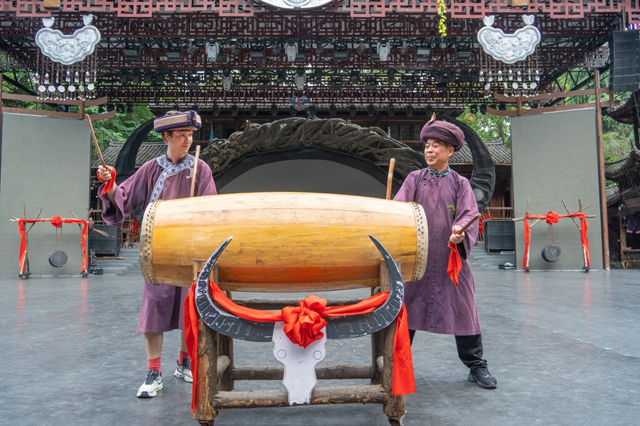 Bogdan Skrykpa, British percussionist, jams on Miao wooden drums with local musician Mo Shihai. (Photo/Yang Qian)