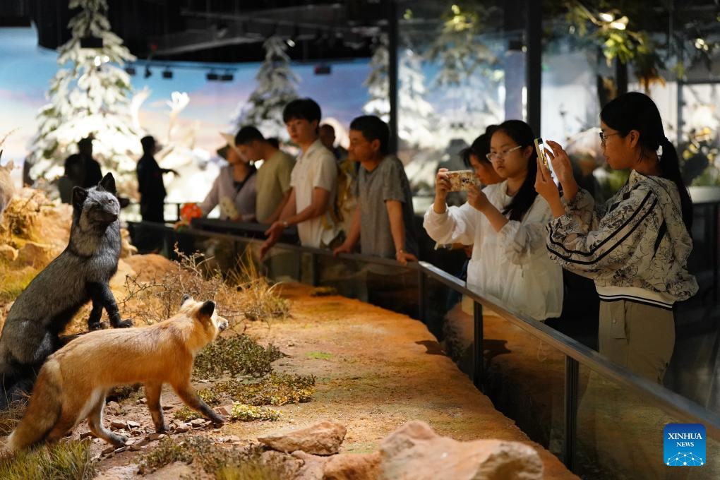 Visitors take photos of animal specimens at the world natural heritage museum of the Chengjiang Fossil site in Chengjiang County, southwest China's Yunnan Province on July 15, 2025.