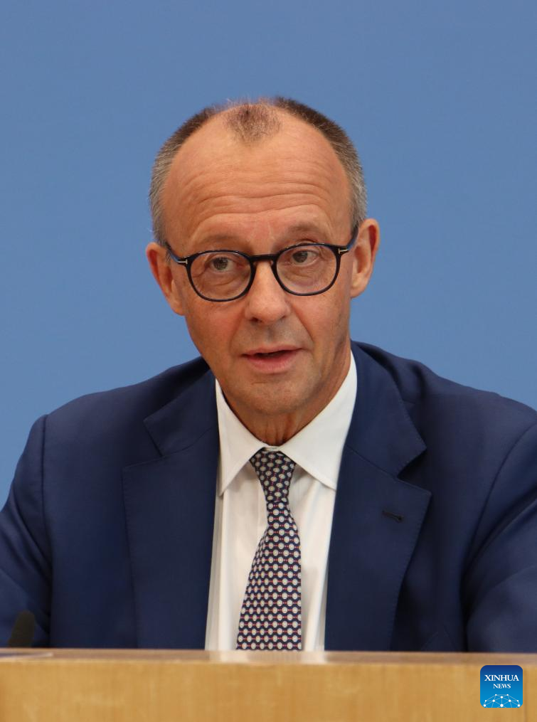 German Chancellor Friedrich Merz speaks during his summer press conference in Berlin, Germany on July 18, 2025. German Chancellor Friedrich Merz on Friday described the current situation in the Gaza Strip as "unacceptable," calling for an immediate ceasefire and comprehensive humanitarian aid for the people there. (Xinhua/Li Hanlin)