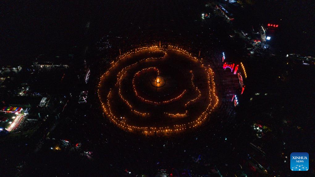 An aerial drone photo shows people celebrating the Torch Festival of Yi ethnic group in Shuicheng District of Liupanshui, southwest China's Guizhou Province, July 18, 2025. Celebrations for the Torch Festival of Yi ethnic group kicked off on Friday at a tourist resort in Shuicheng District of Liupanshui, attracting tourists from across the country. A series of related activities will also take place here on or before Aug. 17. (Xinhua/Tao Liang)