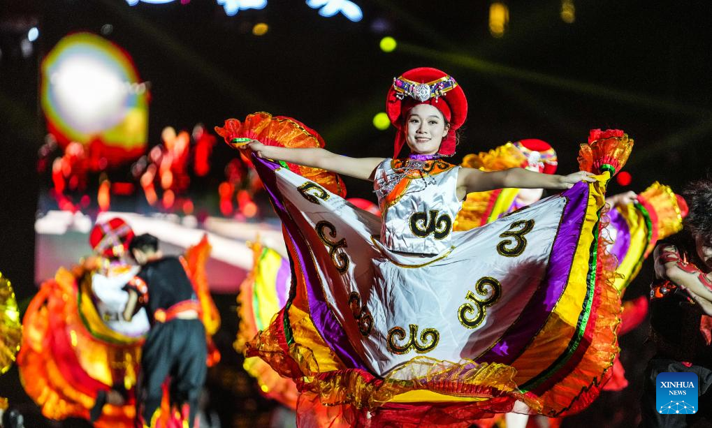Artists perform at the celebration for the Torch Festival of Yi ethnic group held in Shuicheng District of Liupanshui, southwest China's Guizhou Province, July 18, 2025. Celebrations for the Torch Festival of Yi ethnic group kicked off on Friday at a tourist resort in Shuicheng District of Liupanshui, attracting tourists from across the country. A series of related activities will also take place here on or before Aug. 17. (Xinhua/Tao Liang)