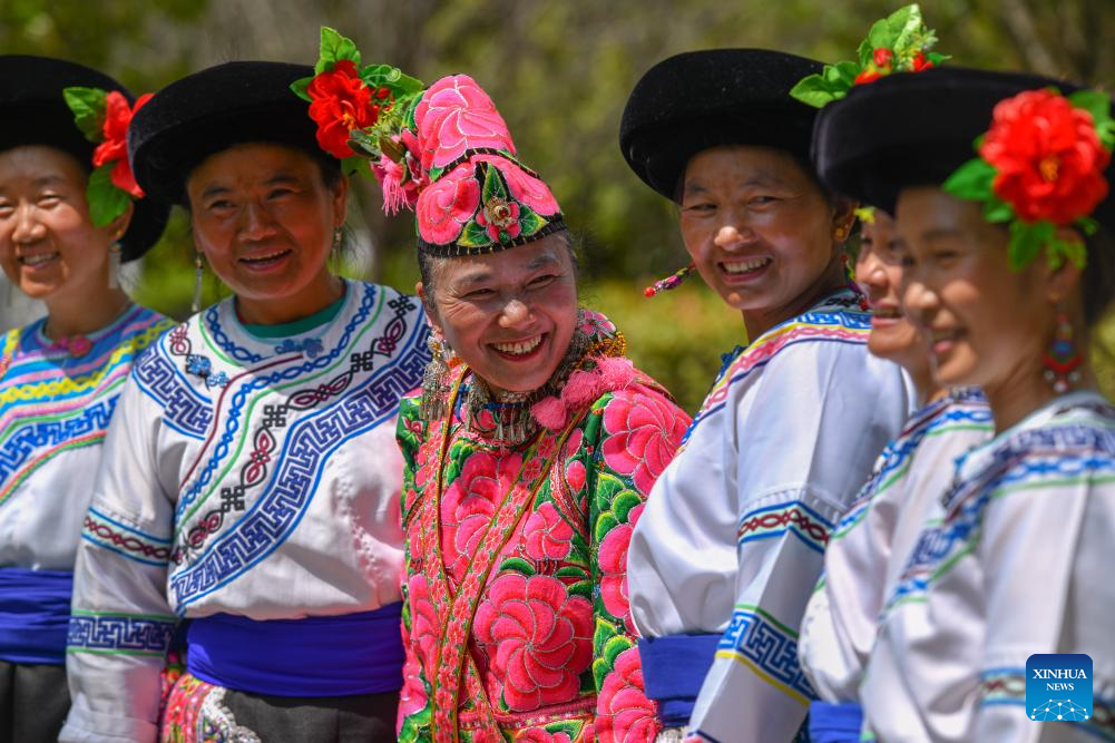 Members of a local Yizu Dage team wave to tourists during a parade show on the ancient street of Nanzhao in Weishan Yi and Hui Autonomous County, Dali Bai Autonomous Prefecture, southwest China's Yunnan Province, July 18, 2025. Yizu Dage, a traditional folk art of the Yi ethnic group usually performed during festivals, weddings, funerals and other gathering occasions, has a history of about 10 centuries and was listed as a national-level intangible cultural heritage in 2008. Weishan is dubbed "cradle of Yizu Dage."