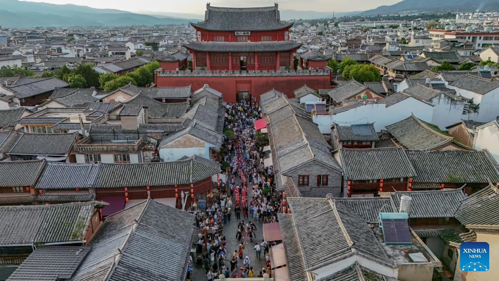 A drone photo taken on July 18, 2025 shows a local Yizu Dage team performing during a parade show on the ancient street of Nanzhao in Weishan Yi and Hui Autonomous County, Dali Bai Autonomous Prefecture, southwest China's Yunnan Province. Yizu Dage, a traditional folk art of the Yi ethnic group usually performed during festivals, weddings, funerals and other gathering occasions, has a history of about 10 centuries and was listed as a national-level intangible cultural heritage in 2008. Weishan is dubbed "cradle of Yizu Dage."