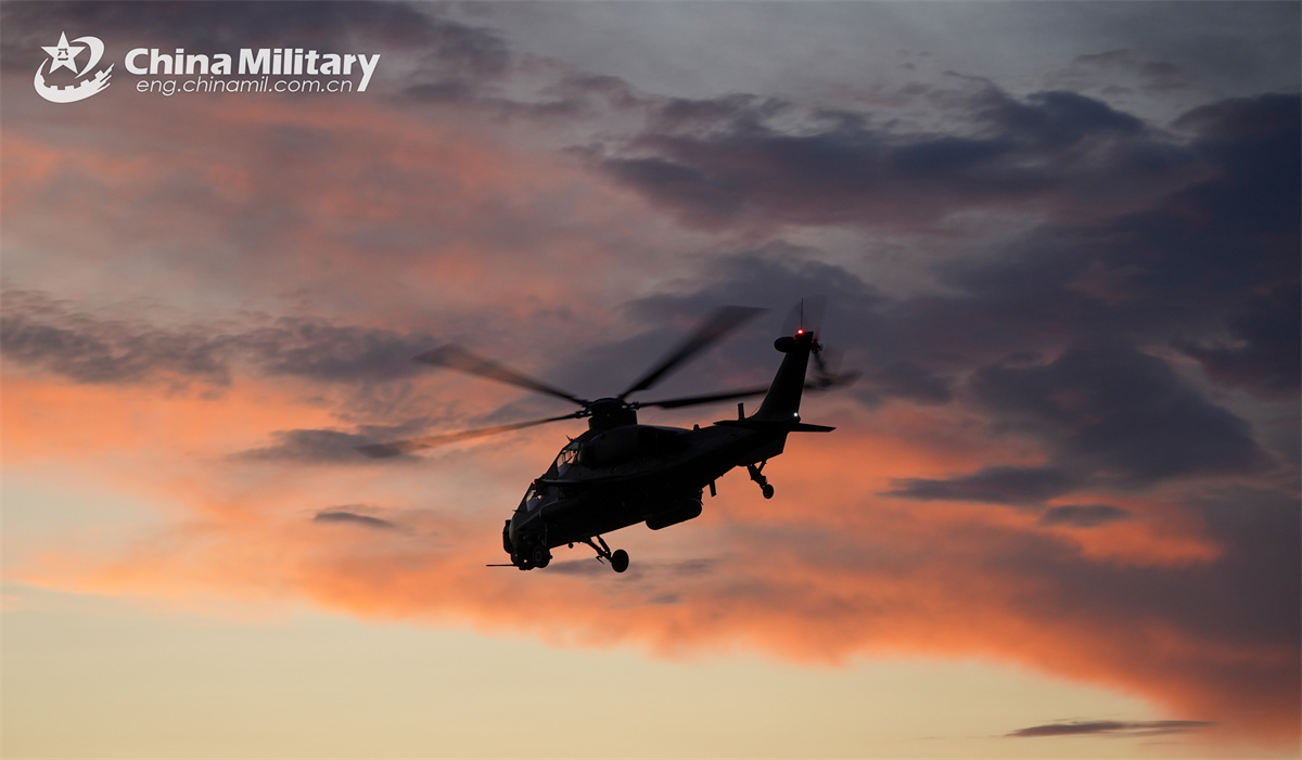 A WZ-10 attack helicopter attached to a brigade under the Chinese PLA Xinjiang Military Command flies in the sky during a flight training exercise on July 5, 2025. (eng.chinamil.com.cn/Photo by Ji Jiantao)
