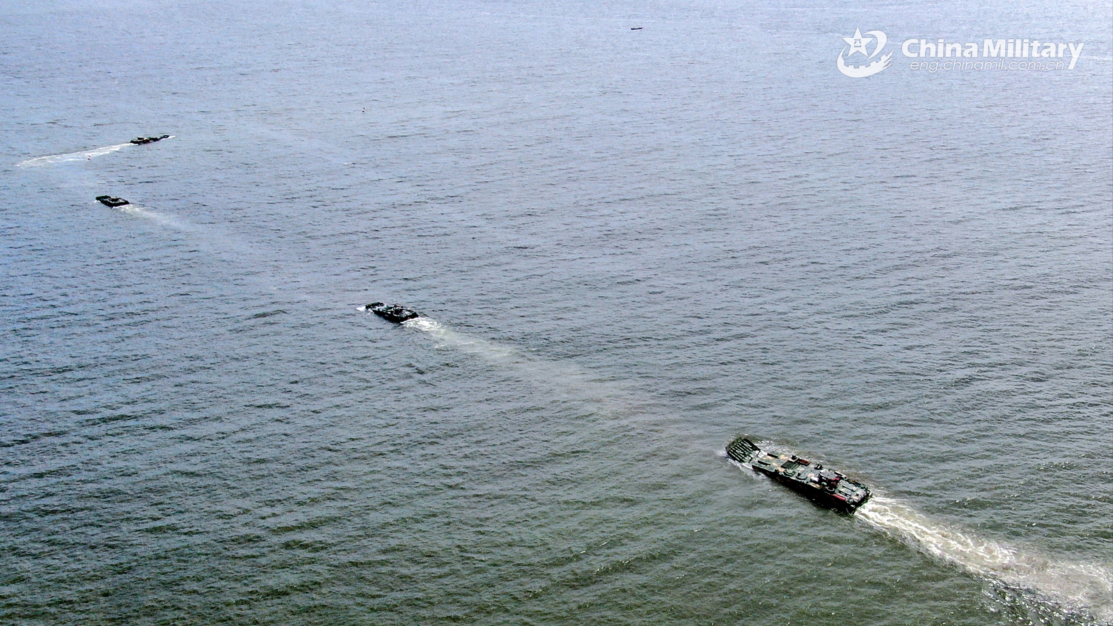 Amphibious armored infantry fighting vehicles (IFV) attached to a brigade with the Chinese PLA Army maneuver towards the designated area during a ferrying and assault wave formation training exercise on July 6, 2025. (eng.chinamil.com.cn/Photo by Zhang Mao)