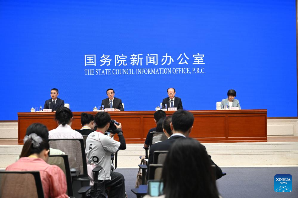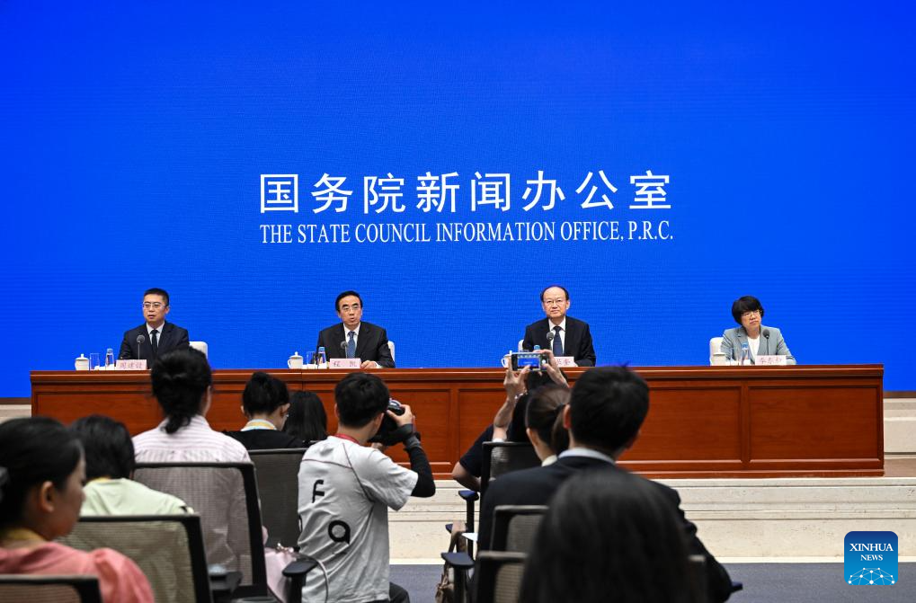 Cheng Kai, chairman of the China Disabled Persons' Federation, Zhou Changkui, secretary of the Communist Party of China leading group of the federation and chairperson of the board of executive directors of the federation, and Li Dongmei, vice chairperson of the federation, attend a press conference held by the State Council Information Office on the achievements in developing the cause of people with disabilities during the 14th Five-Year Plan period (2021-2025), in Beijing, capital of China, July 22, 2025. (Xinhua/Chen Yehua)