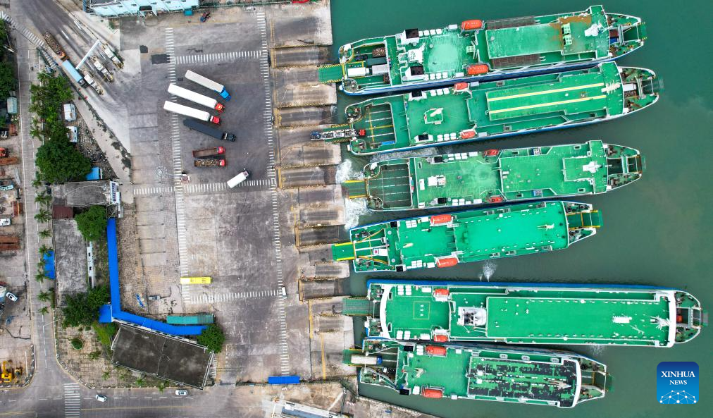 An aerial drone photo taken on July 22, 2025 shows vehicles driving away from ferry ships at Xiuying Port in Haikou, south China's Hainan Province. The passenger and freight ferry service in the Qiongzhou Strait has been resumed in an orderly manner as the impact of Typhoon Wipha weakens. (Xinhua/Yang Guanyu)