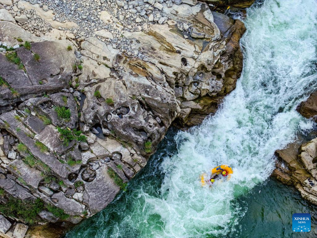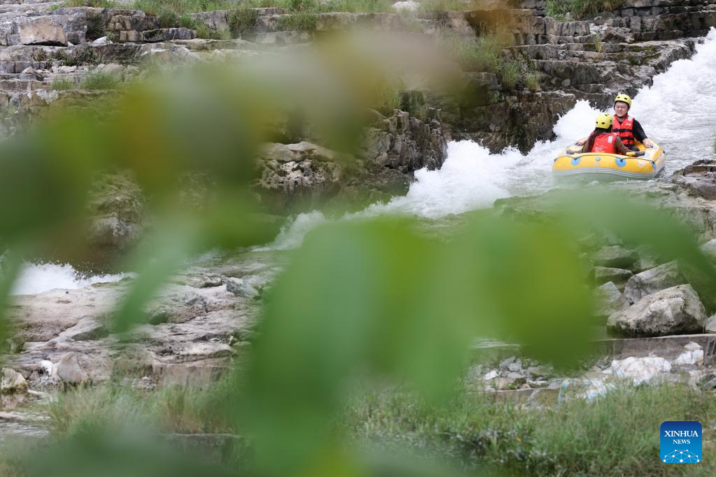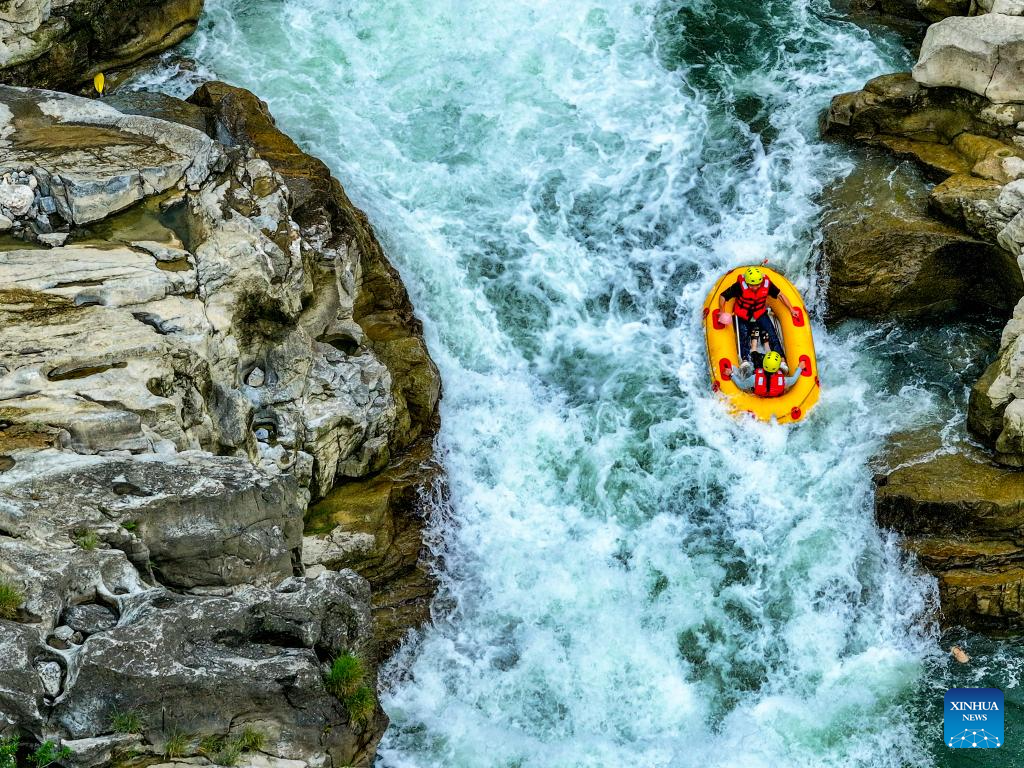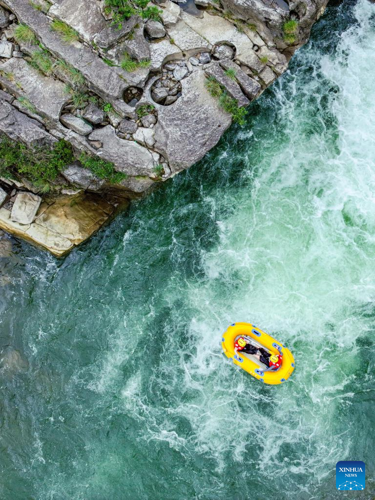 This photo taken on July 21, 2025 shows people rafting in an inflatable boat on Luobei River in Guiding County, southwest China's Guizhou Province. (Xinhua/Ou Dongqu)