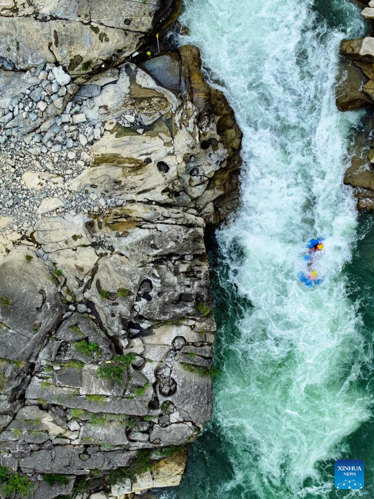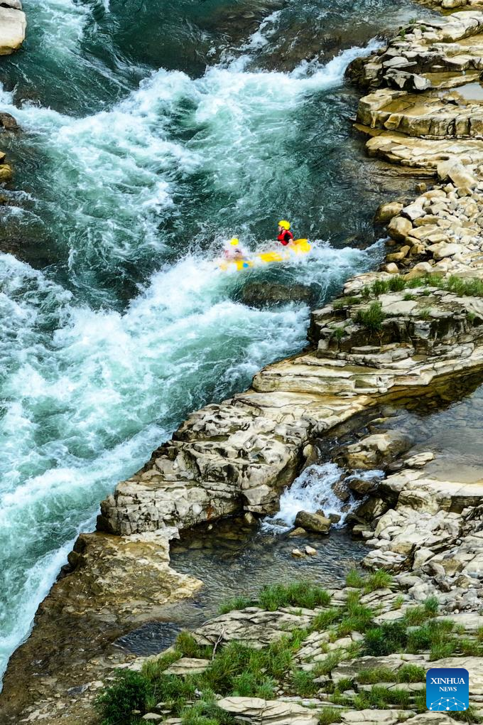 This photo taken on July 21, 2025 shows people rafting in inflatable boats on Luobei River in Guiding County, southwest China's Guizhou Province. (Xinhua/Ou Dongqu)