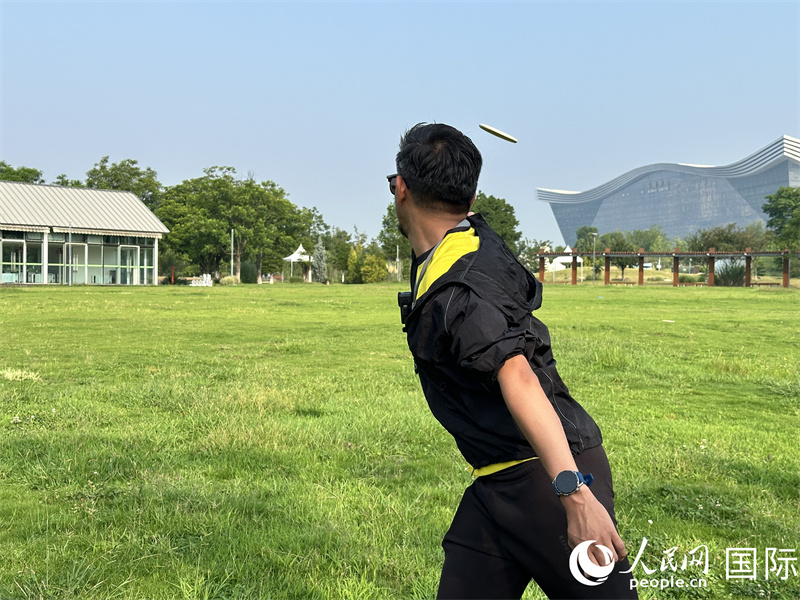 Syukri, a foreign editor with People's Daily Online, practices disc golf moves. (People's Daily Online / Sun Shuyu)